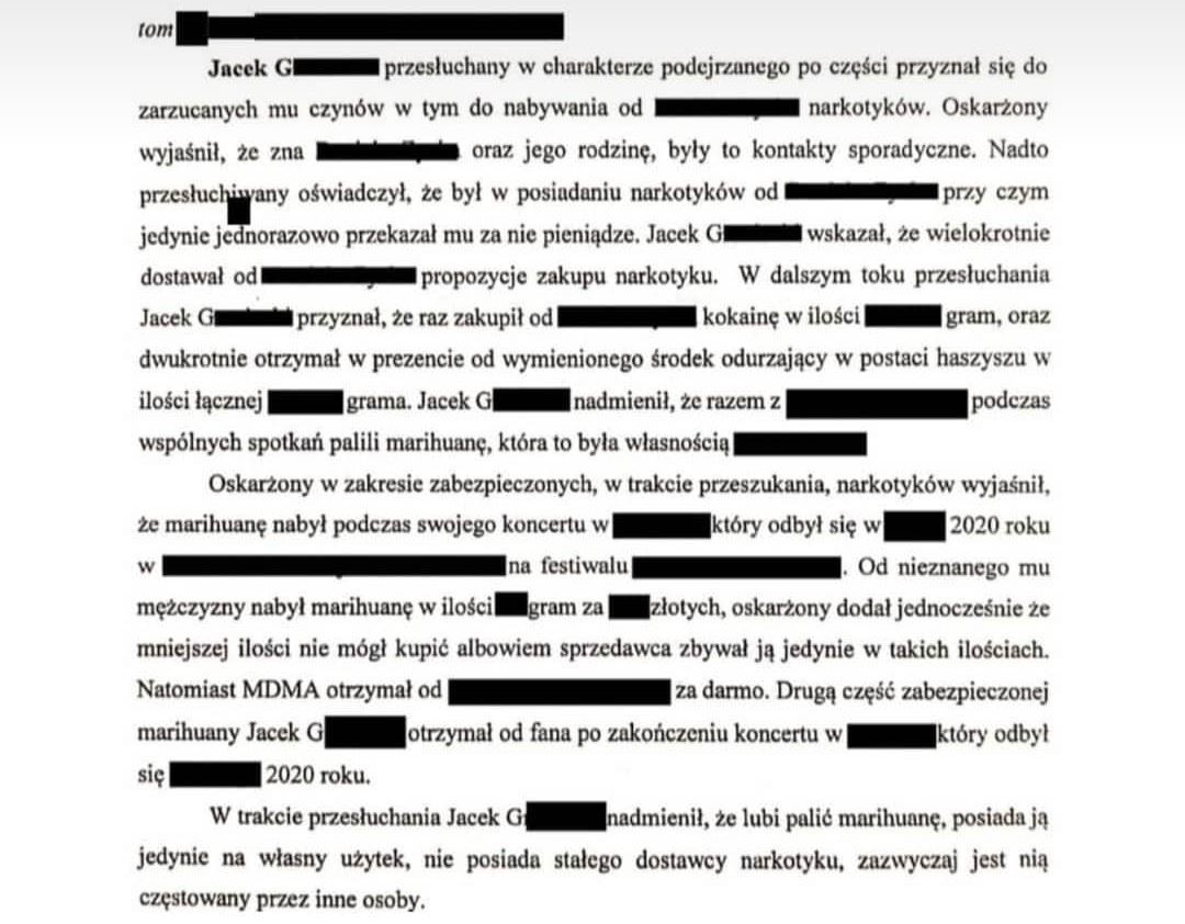 Od nieznajomego mu mężczyzny nabył marihuanę w ilości (zamazane) gram za (zamazane) złotych, oskarżony dodał jednocześnie, że mniejszej ilości nie mógł kupić, albowiem sprzedawca zbywał ją jedynie w takich ilościach. Natomiast MDMA otrzymał od (zamazane) za darmo. Drugą część zabezpieczonej marihuany Jacek G(zamazane) otrzymał od fana po zakończeniu koncertu w (zamazane), który odbył się (zamazane) 2020 roku.