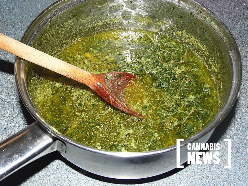 Jeżeli używacie liści i łodyg, należy je wygotować w wodzie. Najlepiej 2-3 razy, za każdym razem wylewając brudną/brązową wodę (sami zobaczycie) i nalewając świeżej Przed produkcją każdego z produktów, należy przeprowadzić dekarboksylację. Pozwoli to na osiągnięcie optymalnego rezultatu, czyli absorbcję jak największej ilości kanabinoidów. Warto też pamiętać, że gotowane zioło (kwiaty, liście) wydziela bardzo silny aromat, dlatego upewnijcie się, że wasz okap kuchenny działa jak należy. W przeciwnym wypadku możecie podpaść sąsiadom…