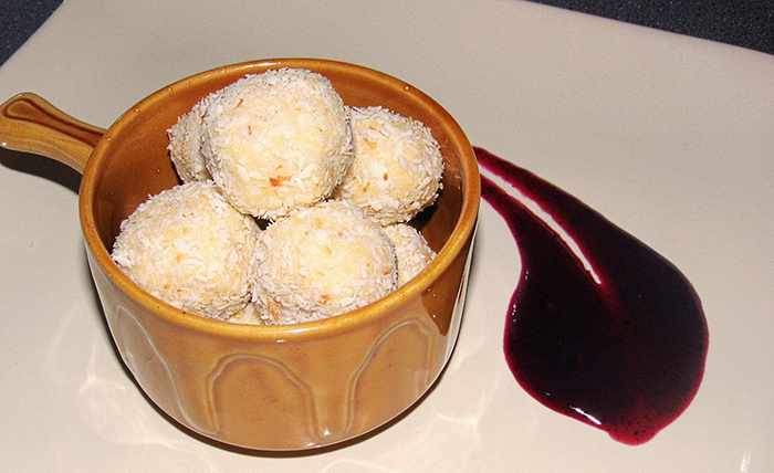 Ten fioletowy sos to coulis z czarnych jagód i czerwonych porzeczek. Owocowe dodatki świetnie komponują sie z tymi, pysznymi, ale bardzo słodkimi kulkami.
