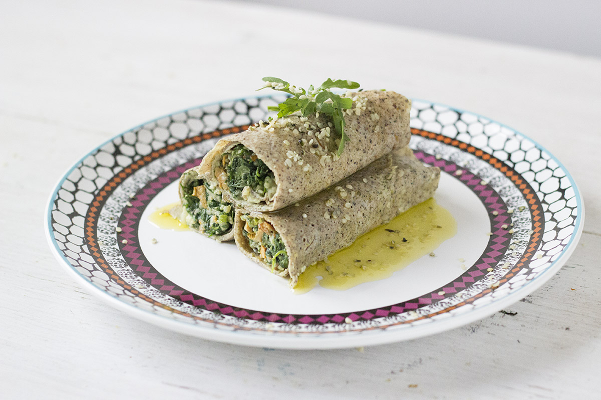 Gotowe naleśniki polewamy oliwą z oliwek lub olejem konopnym, posypujemy nasionami konopi i dekorujemy świeżą rukolą.