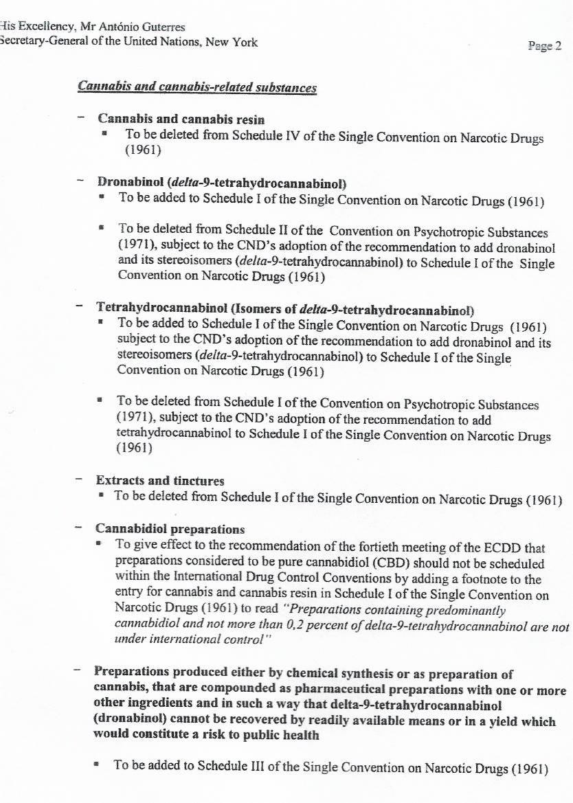 Leki farmaceutyczne zawierające izomer THC, delta-9-tetrahydrokannabinol, produkowane na bazie syntezy chemicznej czy przetwórstwa konopi indyjskich, mają zostać dodane do grupy IV Jednolitej Konwencji o Środkach Odurzających (1961). Jedynym warunkiem tego wpisu, ma byc gwarancja, iż THC nie może być łatwo ‘odzyskiwalne’ z preparatów medycznych czy upraw, co może zagrażać zdrowiu publicznemu.