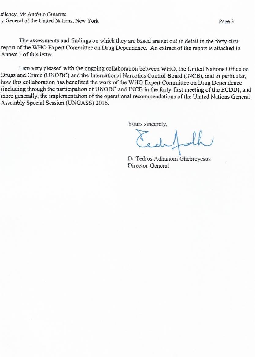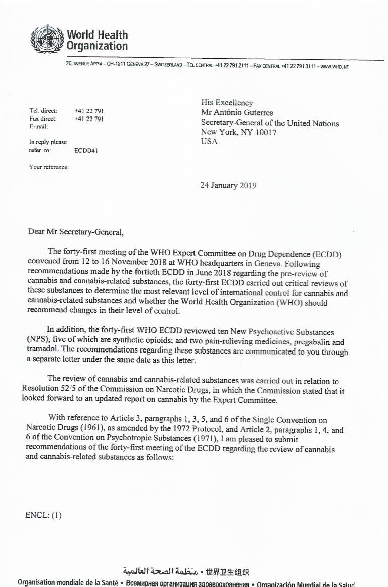 Światowa Organizacja Zdrowia przesyła do Sekretarza Generalnego ONZ list, w którym sugeruje zmianę klasyfikacji marihuany w międzynarodowych traktatach narkotykowych. Dotychczas marihuana należała do najbardziej restrykcyjnej kategorii substancji psychoaktywnych.