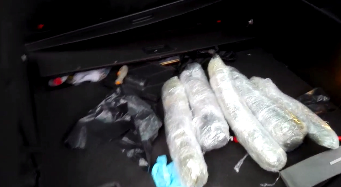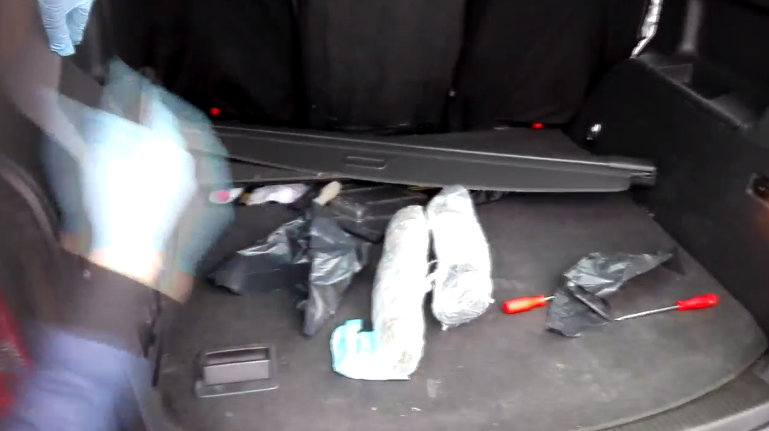 W bagażniku, po obu stronach, pod panelami tapicerki znaleźli po trzy szczelinie zawinięte paczki z marihuaną. Takie same paczki znaleźli w przednich drzwiach po stronie kierowcy i pasażera.