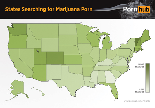 Ciekawostką jest również zależność pomiędzy statusem prawnym marihuany na danym obszarze a ilością wyszukiwań porno związanego z ziołem wśród jego mieszkańców. W tych stanach, gdzie marihuana medyczna i rekreacyjna jest legalna wyszukuje się takiego porno o 14% więcej w stosunku do średniej ogólnokrajowej w USA, podczas gdy w stanach, gdzie jest całkowicie zakazana – o 6% poniżej średniej krajowej.