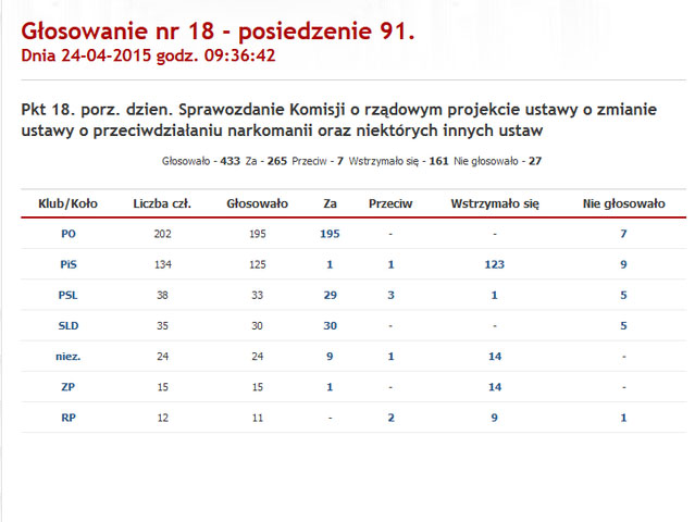 Niepokojąca zmiana ustawy, faktycznie zaostrzająca represyjność wobec użytkowników marihuany, została przyjęta przez sejm. Za przyjęciem (265 głosów) byli posłowie PO-PSL-SLD. Przeciw było 7 posłów: 5-ciu Palikota, Wipler i 1 z PiS, ale chyba przez pomyłkę, bo PiS generalnie wstrzymał się od głosu, podobnie jak reszta posłów Palikota.