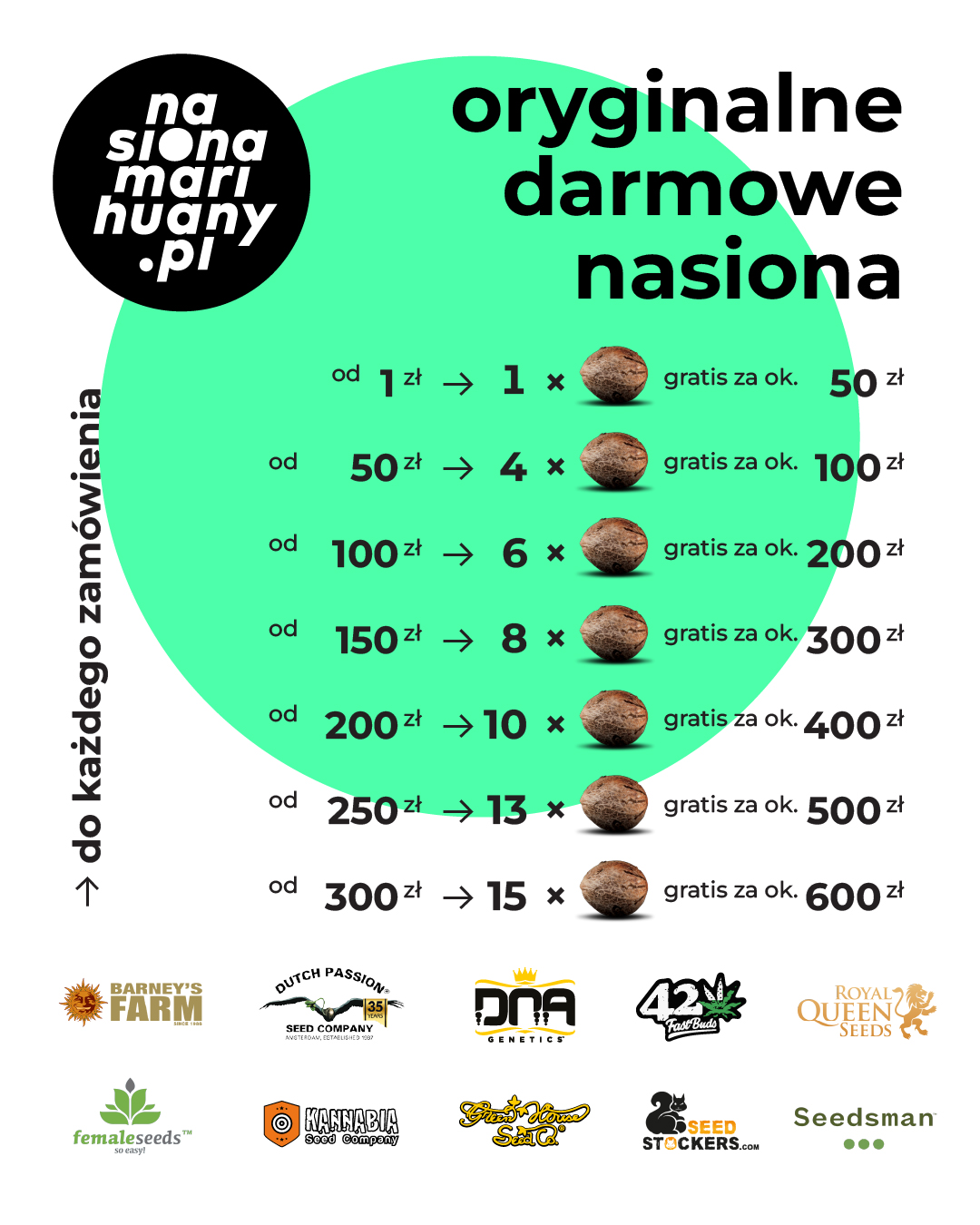 Wiadomo, że to nie kwiecień i tym samym nie prima aprilis, tylko najlepsza w Polsce i (a może i w Europie) jesienna promocja “Oryginalne darmowe nasiona” sklepu Nasionamarihuany.pl Najwyższej jakości, sprawdzone pestki konopi indyjskich z renomowanych seed banków z całego świata możecie otrzymać zupełnie za darmo, robiąc nawet najmniejsze zakupy! Sprawdziliśmy to dokładnie, porównaliśmy też promocje innych sklepów i tej oferty Nasionamarihuany.pl nikt dotąd nie przebił i raczej nie przebije.
