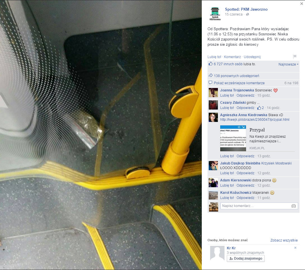 Na profilu Spotted: PKM Jaworzno jeden z fanów umieścił zdjęcie, z zapytaniem o właściciela woreczka z marihuaną,  na moje oko, ktoś jest stratny  jakieś 10g. Jeżeli któremuś z was brakuje, może się zgłosić do kierowcy;) (oczywiście nie polecamy).