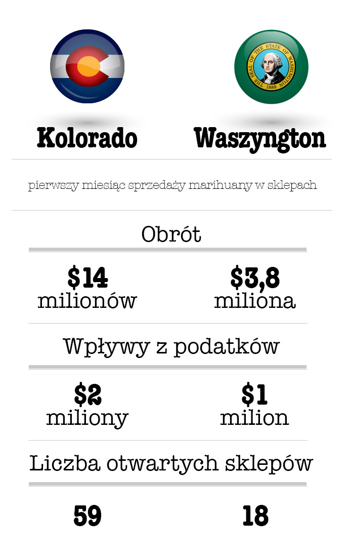 Warto zauważyć, że w Kolorado od dawna istniał już sprawnie działający system sprzedaży marihuany medycznej, co pozwoliło branży prędzej dostosować się do wymogów prawnych dotyczących sprzedaży marihuany rekreacyjnej. W efekcie, w pierwszym miesiącu powstało tam prawie trzykrotnie więcej sklepów oferujących zioło niż w stanie Waszyngton. To pociągnęło za sobą wyższe wyniki sprzedaży oraz wpływy z podatków.