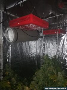 Po przeczołganiu się przez otwór, oczom policji ukazały sie 3 growboxy, w których łącznie było uprawiane 53 rośliny konopi indyjskich. Oprócz growboxów, znaleziono blisko 1,5 kg suszu konopnego. Wstępny test wykazał obecność THC, więc susz został uznany za marihuanę.
